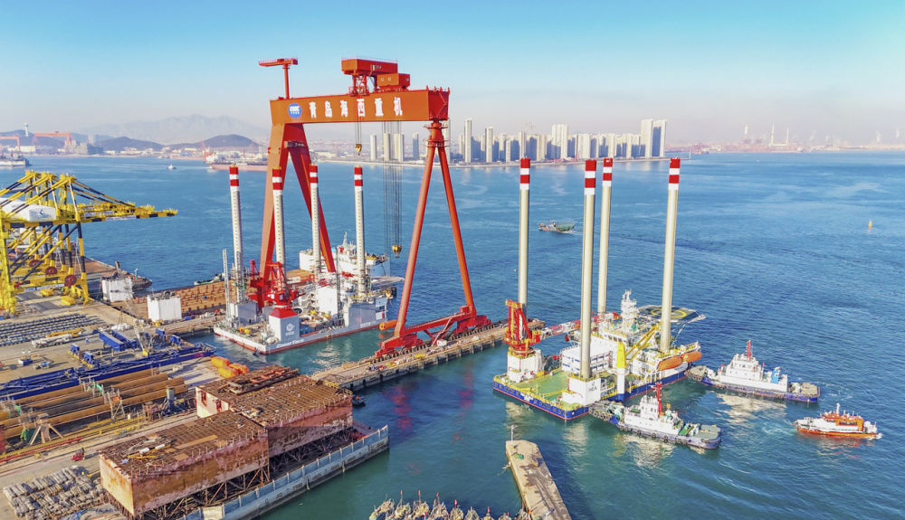 1月22日,由中船武汉船机海西重机自主设计建造的两座新一代自升式海上作业支持平台停靠岸边,准备从青岛西海岸新区发往中东。新华社发(张进刚摄)