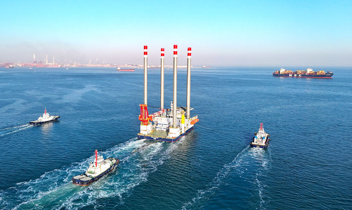 在威海乳山南海域的山东半岛南U场址海上风电项目现场,一排排“大风车”屹立碧波之上,将徐徐海风转化为电能,再源源不断地输送至陆地。风电装备制造产业在岸边同步崛起,乳山海域的风力发电机组中,本地配套率正随着产业链的持续完善,得到不断提升。
