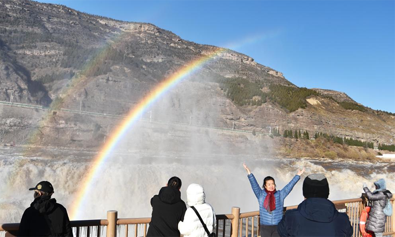 受上游水库调节放水影响,位于山西吉县和陕西宜川县交界处的黄河壶口瀑布水量增大,飞溅的水雾在阳光照射下形成“双彩虹”,吸引了众多游客。