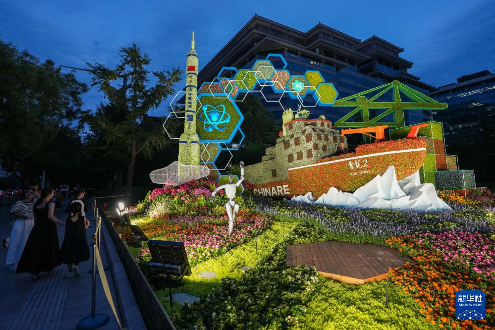 8月22日,人们在北京西单参观“科技强国”花坛。