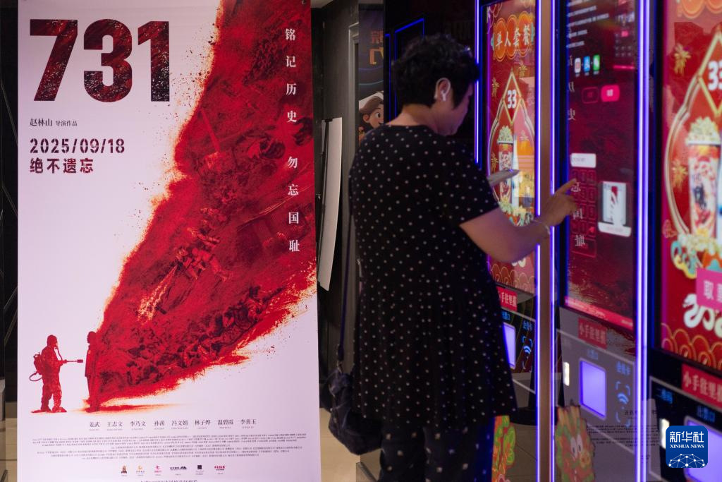 9月18日,在北京市一家电影院,人们在电影《731》海报前取票准备观影。