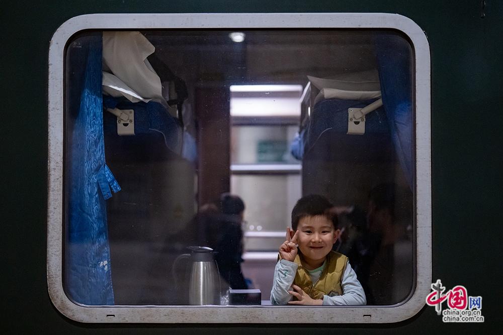 2月2日,北京局2026年春运工作正式拉开帷幕,春运首班列车K4069次上的小乘客开心比耶。中国网记者 郑亮摄