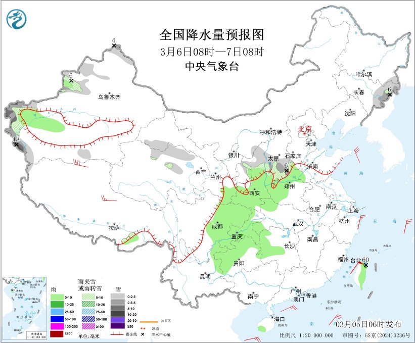 图1 全国降水量预报图(3月5日08时-6日08时)