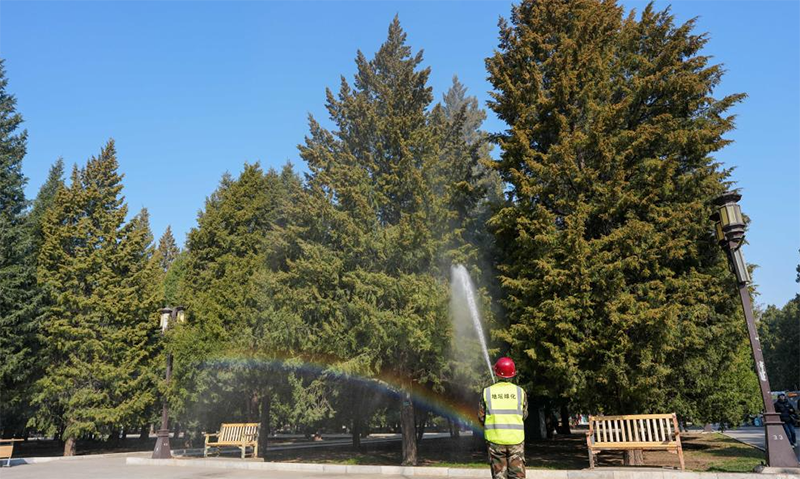 3月15日,在北京地坛公园,工作人员使用添加了花粉控制剂的水对柏树进行喷淋。