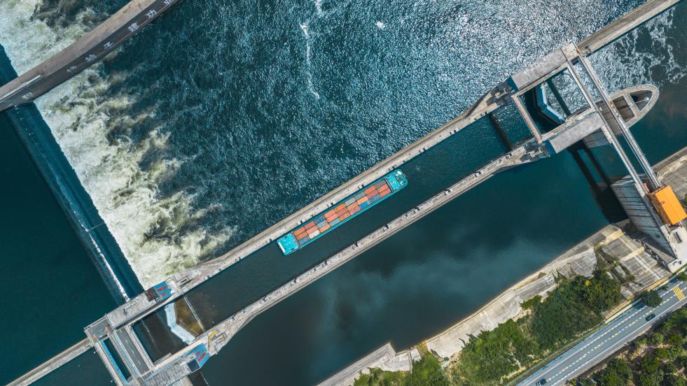 一艘货船通过闽江水口航运枢纽。新华社发