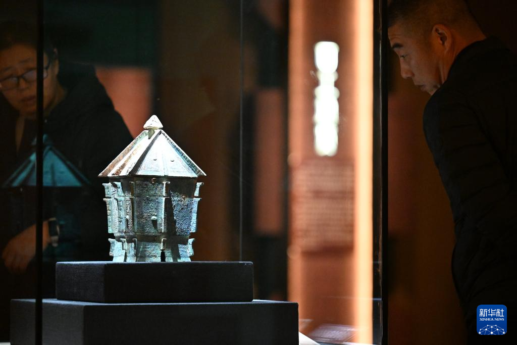 11月29日在展览上拍摄的展出文物嵌绿松石骨虎。