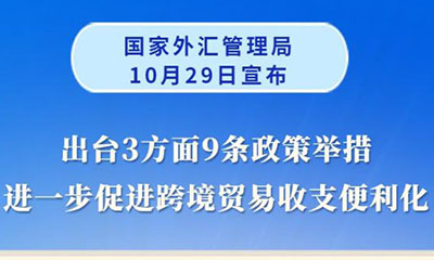 国家外汇管理局10月29日对外发布3方面9条政策举措,进一步促进跨境贸易收支便利化,积极支持对外贸易发展。