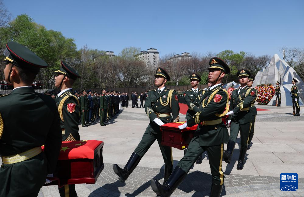 4月23日,礼兵护送志愿军烈士遗骸棺椁就位。新华社记者 韩赫 摄