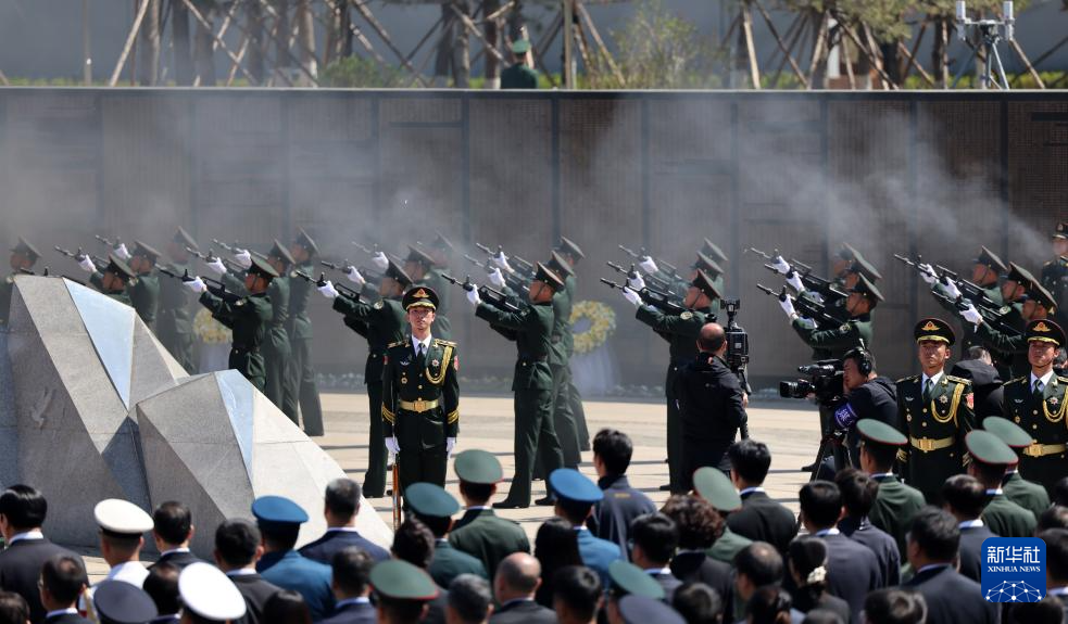 4月23日,礼兵鸣枪向志愿军烈士致敬。新华社记者 韩赫 摄