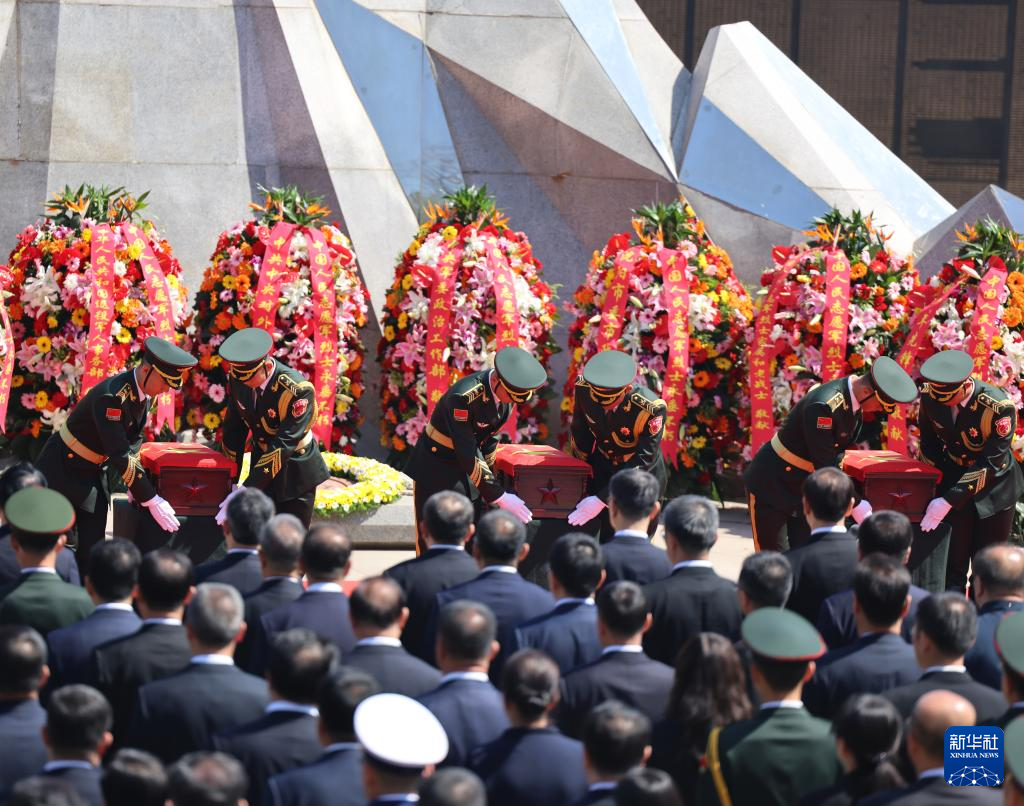 4月23日,在沈阳抗美援朝烈士陵园,志愿军烈士棺椁摆放在纪念广场。新华社记者 李钢 摄