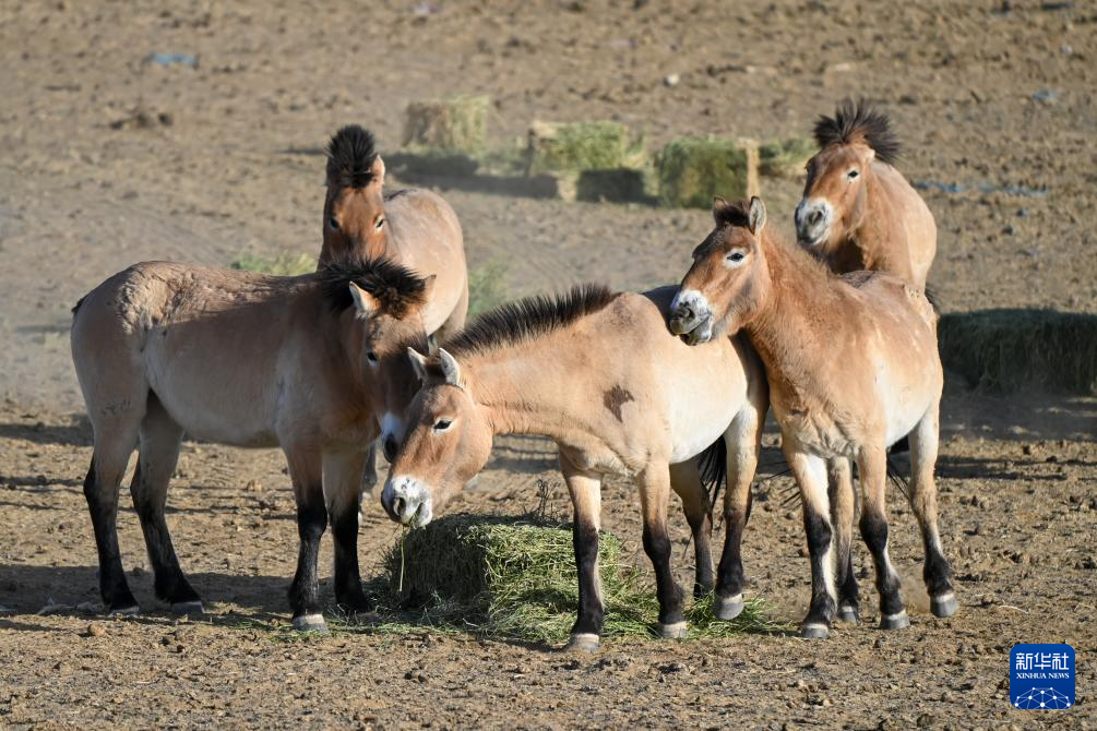 在新疆卡拉麦里山有蹄类野生动物自然保护区,工作人员为普氏野马投放草料(4月21日摄)。
