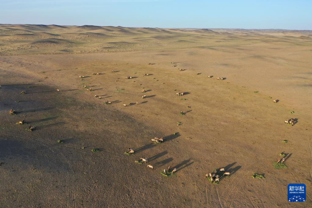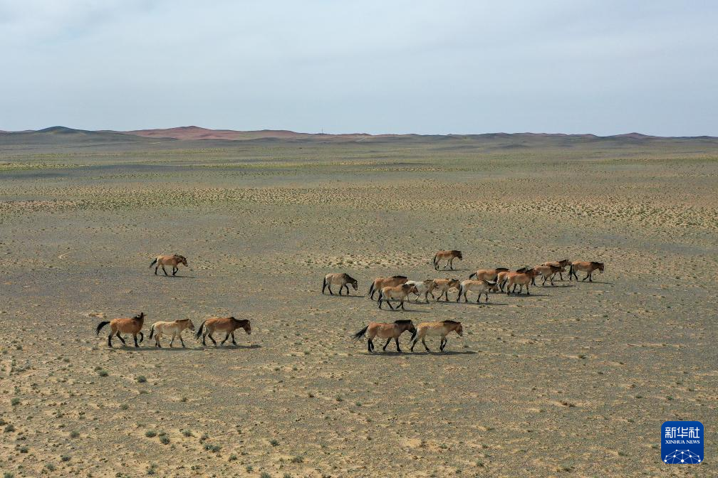 这是在新疆卡拉麦里山有蹄类野生动物自然保护区拍摄的回归野外的普氏野马(4月22日摄,无人机照片)。